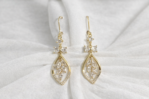 Arete Largo Oro Laminado Flor Caida Piedras Rojas